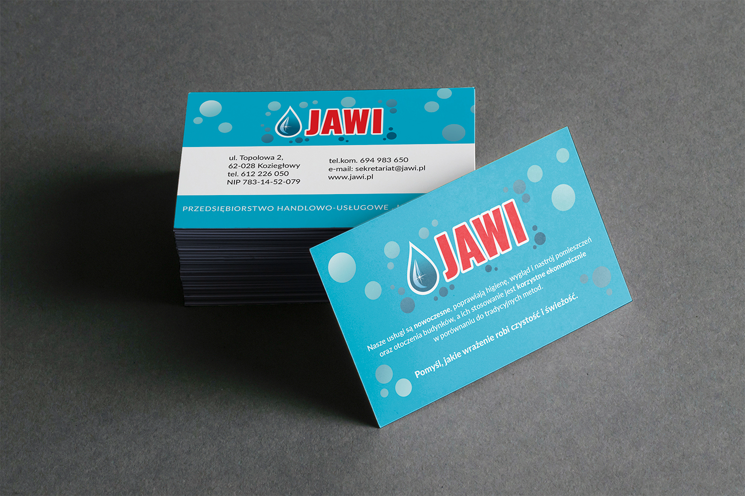 Dla JAWI stworzyliśmy wizytówki, które wyróżniają się elegancją i przejrzystością, zapewniając doskonałe pierwsze wrażenie podczas każdego spotkania biznesowego. Dopracowaliśmy każdy detal, aby oddać profesjonalizm i wszechstronność firmy.